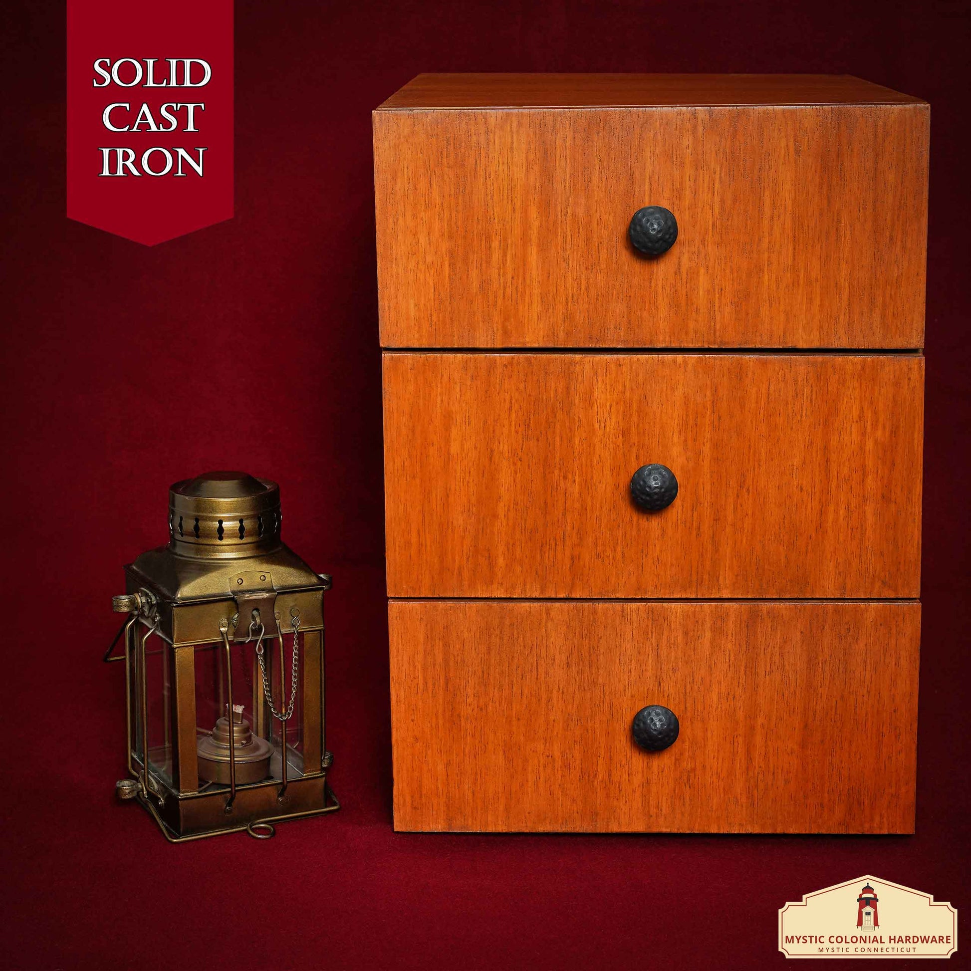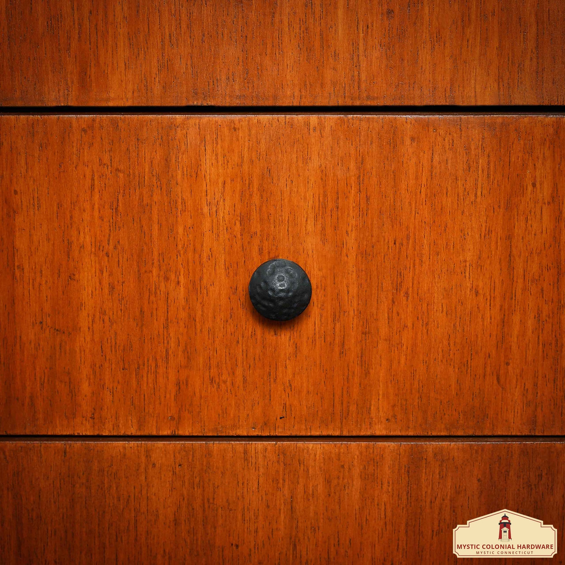 - ⭐ 1 1/4" Hand Forged Iron Round Knob brings the rustic look of forged iron to your cabinets and drawers. The round top has a hand hammered appearance and is offered in Oil Blackened Coat finish. Individual hand forging results in unique pieces with no two exactly alike.