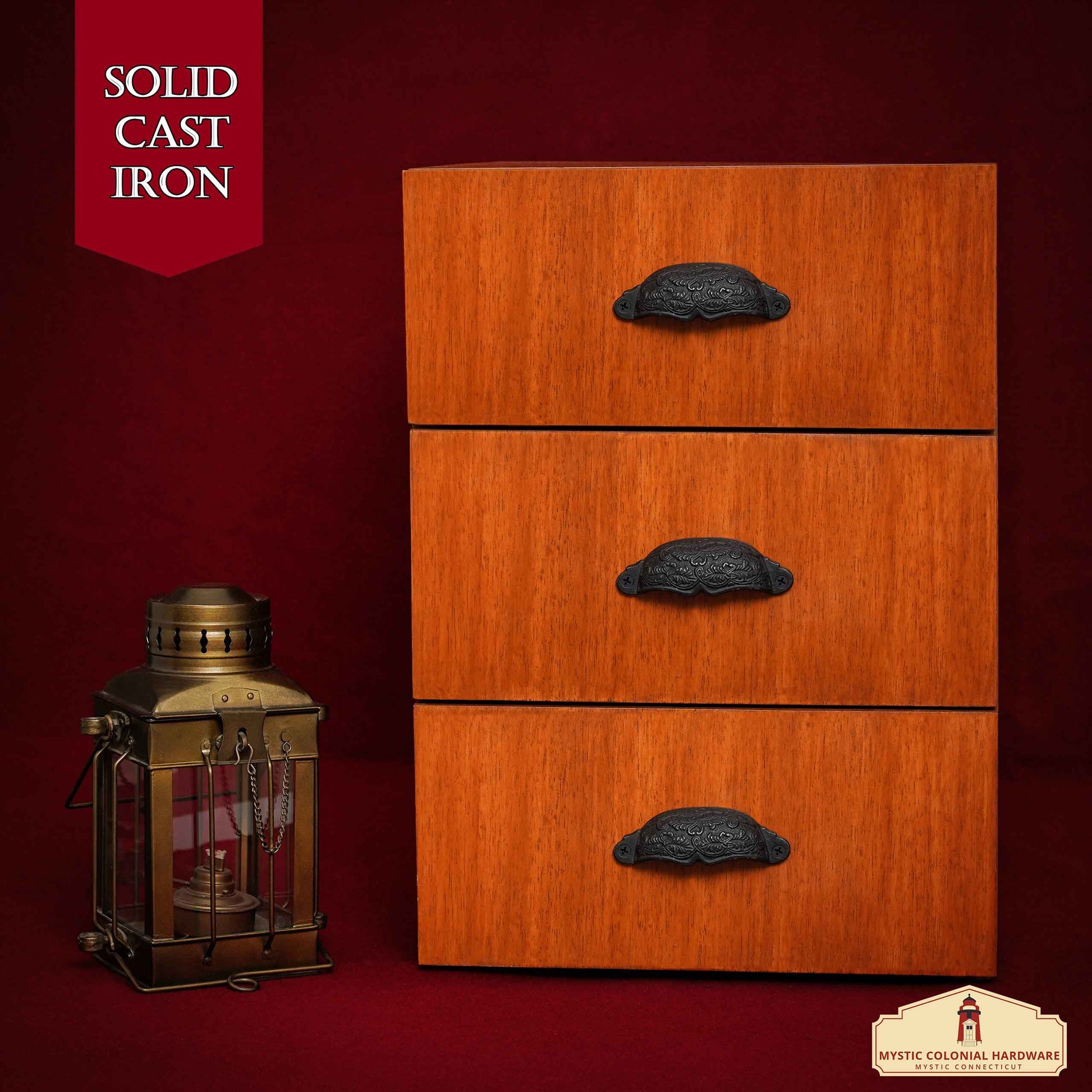 Rustic Cast Iron Set of 4 Drawer Pulls Cabinet Cup Pulls: Ideal for Victorian, Colonial, Retro, Steampunk, Gothic, Baroque, and Medieval Settings, (10.5x3.5) cm