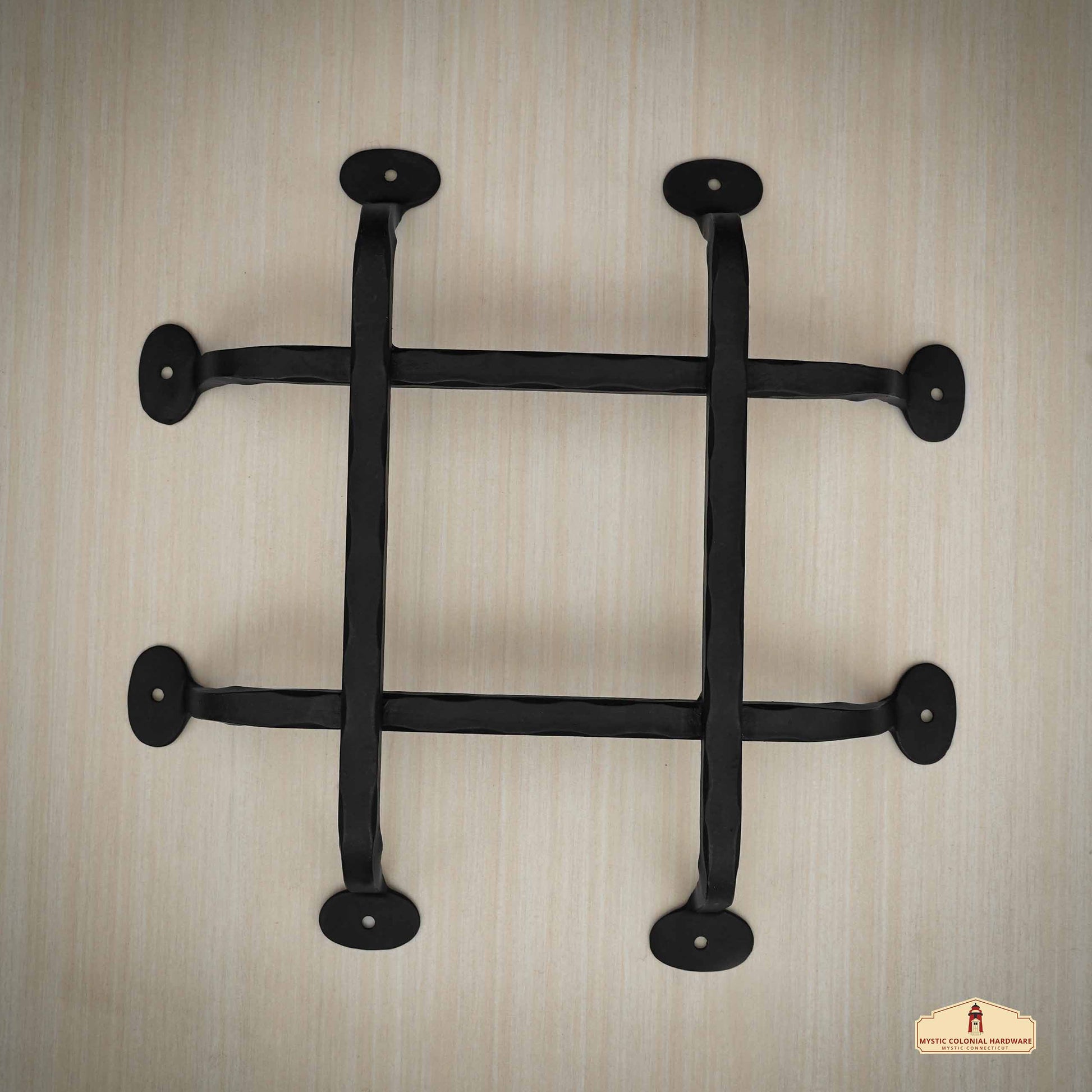 ⭐Total size: (28.7x29.1) cm (11.29”x11.45”). Distance between the diagonal set of holes (4.8 mm diameter each): 11.3 cm (4.4”). Distance between the vertical set of holes: 11.4 cm (4.4”). The number of screws included: 8. Total screw length: 1.5 inches. Since this is a hand-forged product, slight variations in size and shape must be expected.